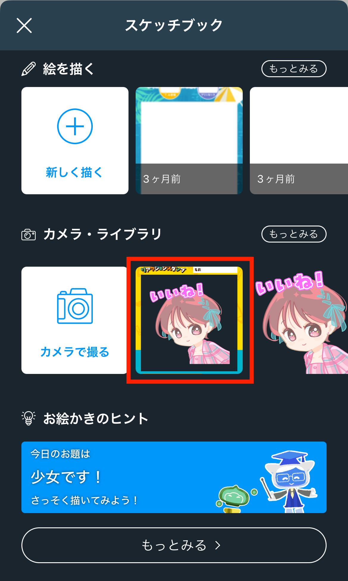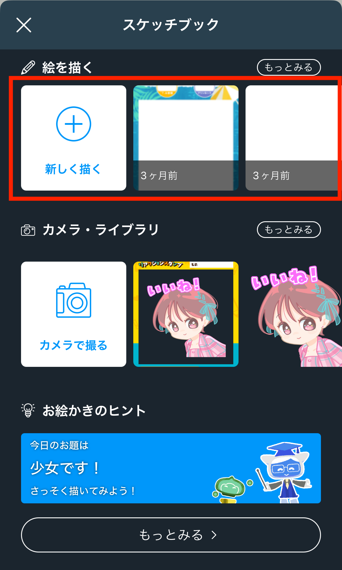 - 「絵を描く」で「新しく描く」もしくは既存のキャンバスをタップする。