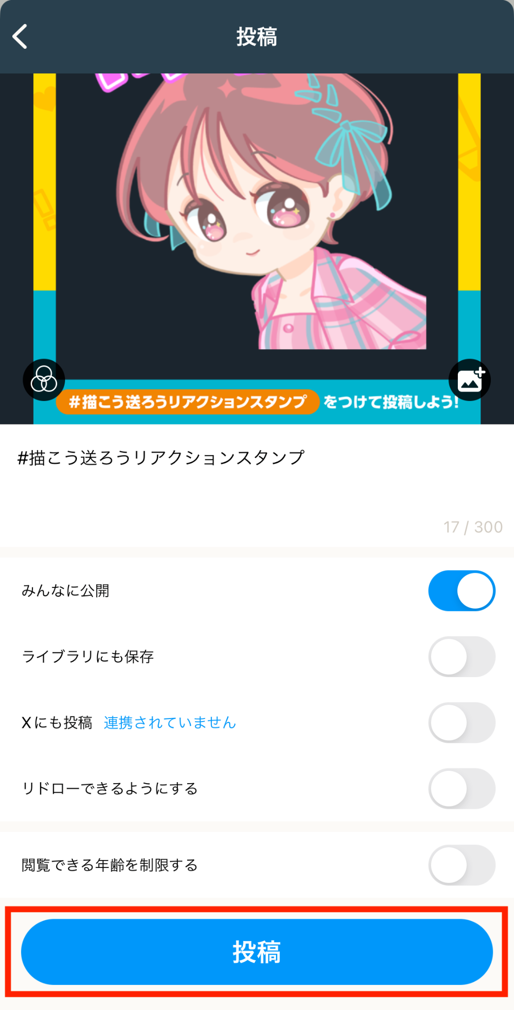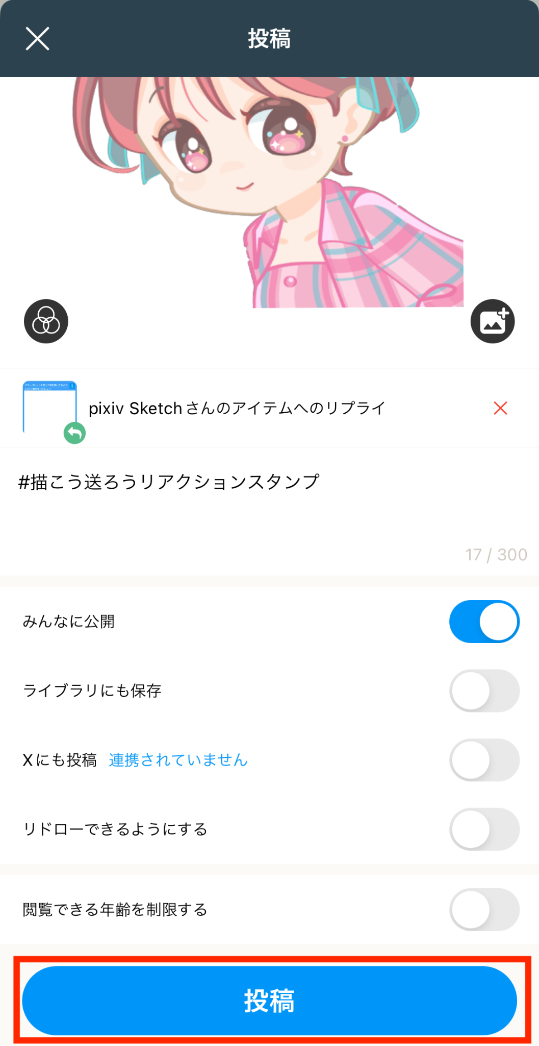 - リプライを送りたい投稿のから、「描いて投稿」をクリックする。